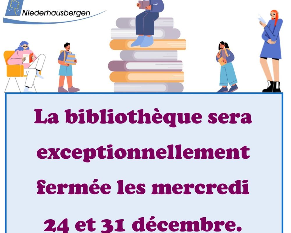 Dans le cadre du calendrier des fêtes, la bibliothèque sera exceptionnellement fermée les mercredi 24 et 31 décembre.
